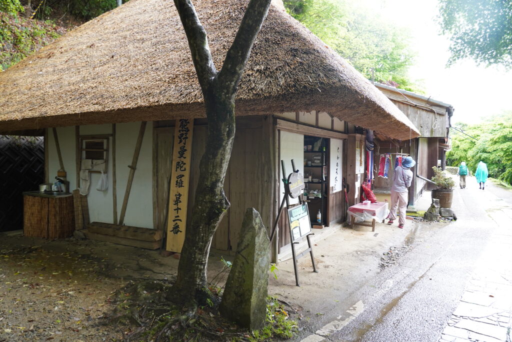 外国人パーティーに囲まれつつ、50分ほどで継桜王子へ到着。ここは有人の休憩所も併設されていて、休憩することができました。雨がかなり土砂降りになってきたので、しばらくの雨宿り。