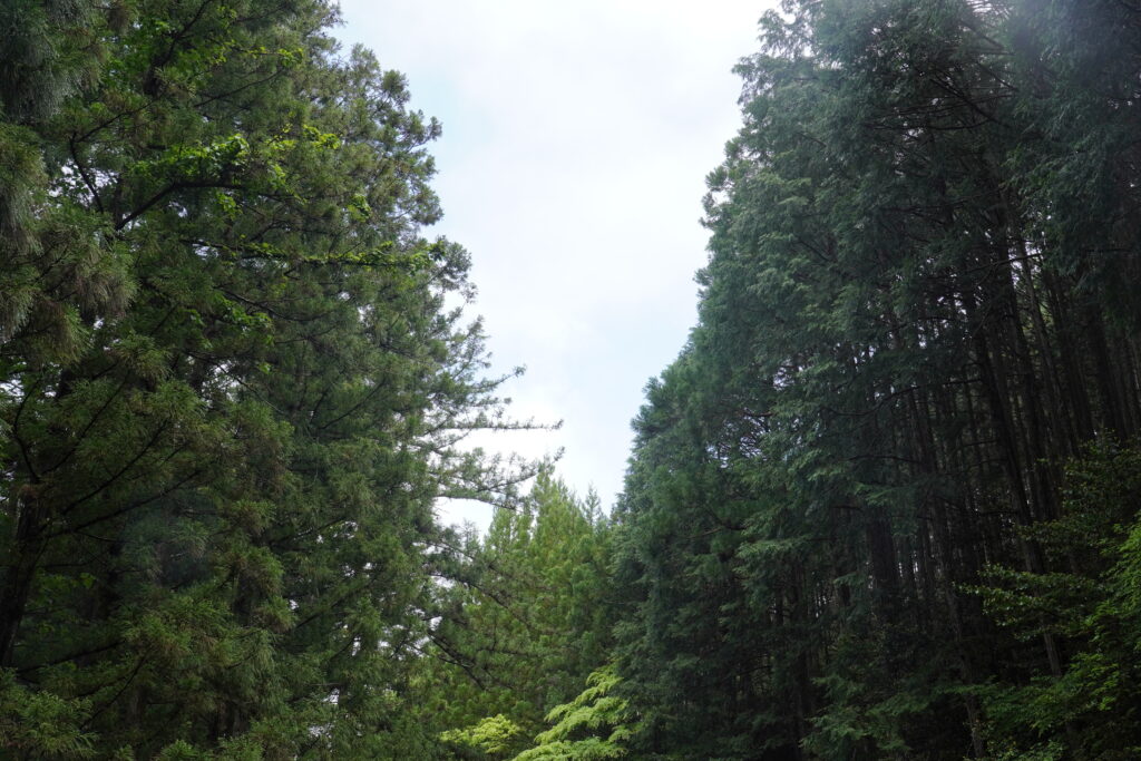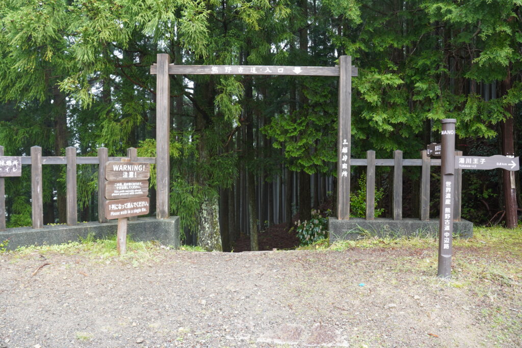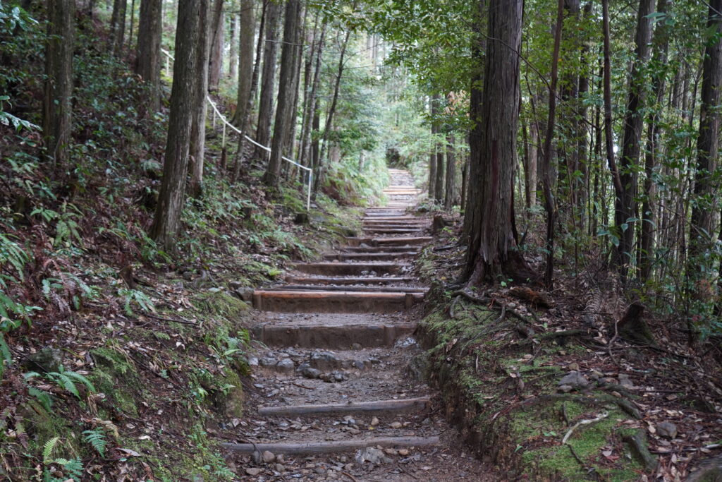近露から途中の比曽原王子までは、深くて暗い森を抜けていきます。森を抜けた後は、継桜までロードの急坂が続きます。