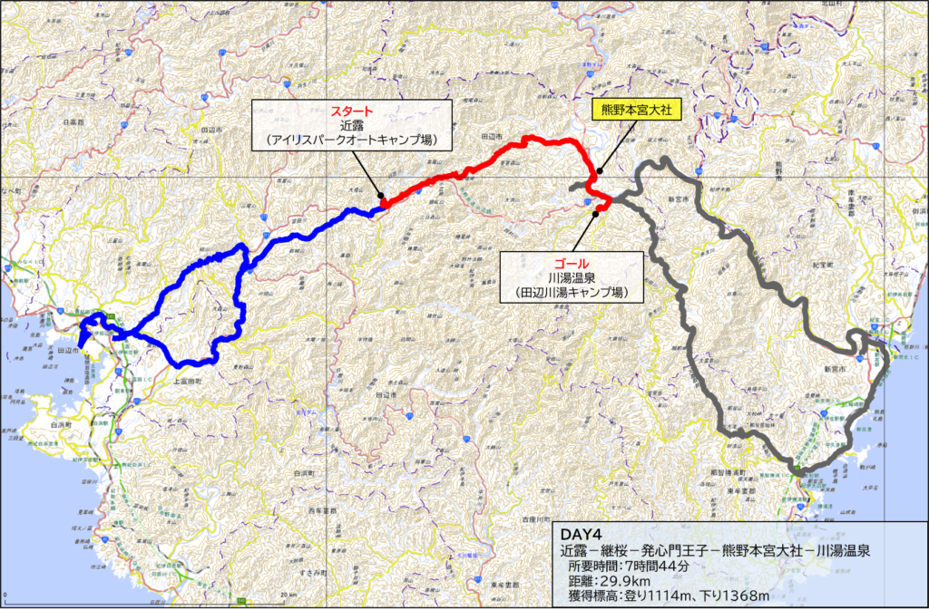 4日目は近露をスタート、継桜王子の後に発心門王子を通り、熊野本宮大社を参拝、そして川湯温泉までの29.9kmとなります。